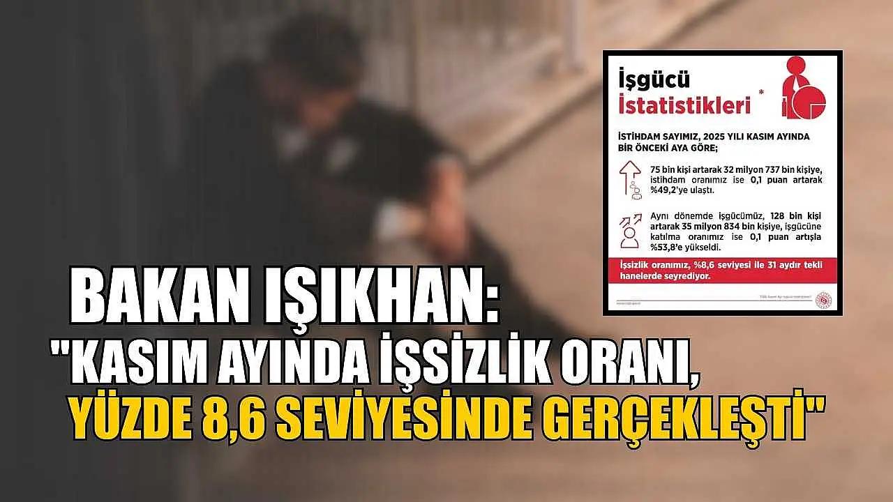 Çalışma ve Sosyal Güvenlik Bakanı Vedat Işıkhan, 'Kasım ayında işsizlik oranı, yüzde 8,6 seviyesinde gerçekleşti. Böylelikle 31 aydır tekli hanelerde seyrini sürdürüyor' dedi.