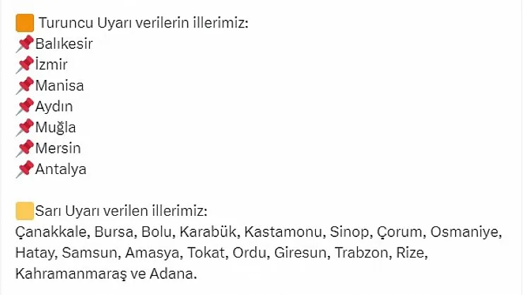İçişleri Bakanı Ali Yerlikaya, X hesabından yaptığı paylaşımda yarın Balıkesir başta olmak üzere İzmir, Manisa, Aydın, Muğla, Mersin, Antalya illerinde turuncu kodlu uyarıda bulundu. Çanakkale, Bursa, Bolu, Karabük, Kastamonu, Sinop, Çorum, Osmaniye, Hatay, Samsun, Amasya, Tokat, Ordu, Giresun, Trabzon, Rize,
