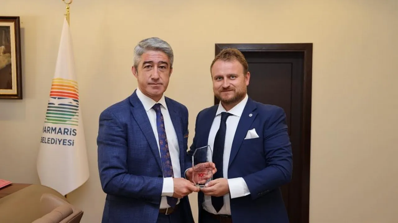Marmaris Belediye Başkanı Mehmet Oktay'ı makamında ziyaret eden Marmarisli genç iş adamları plaket takdim etti.