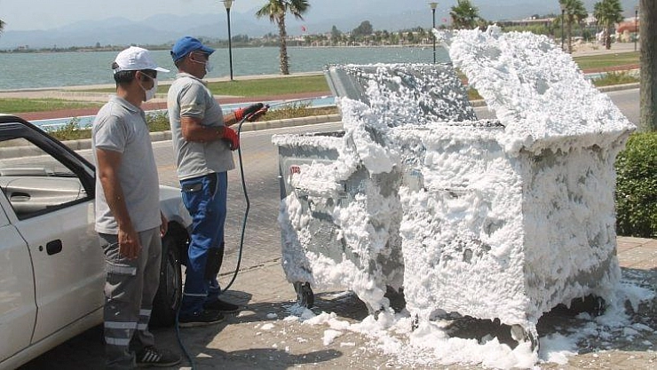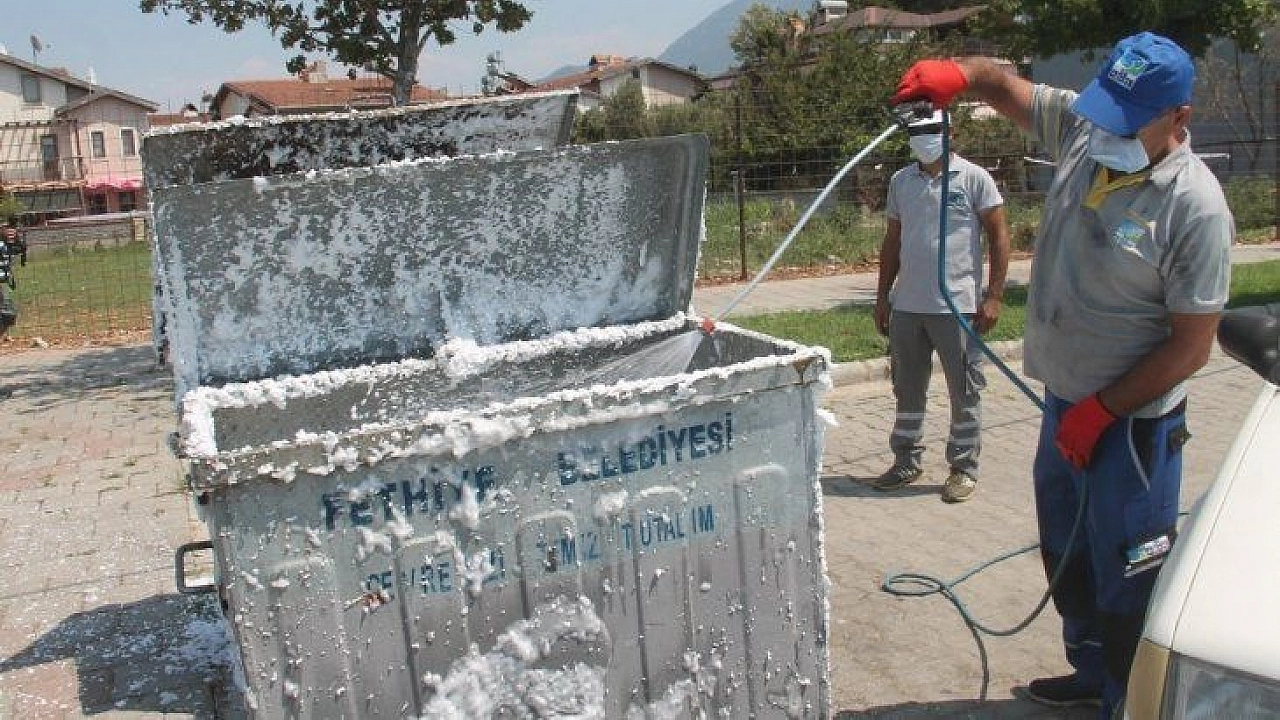 Kurban Bayramı'nın ardından 4 günlük tatilde kurban atıkları ve diğer atıkların yoğun şekilde atıldığı çöp konteynırları Fethiye Belediyesi Temizlik İşleri Müdürlüğü ekipleri tarafından dezenfekte edilmeye başlandı.