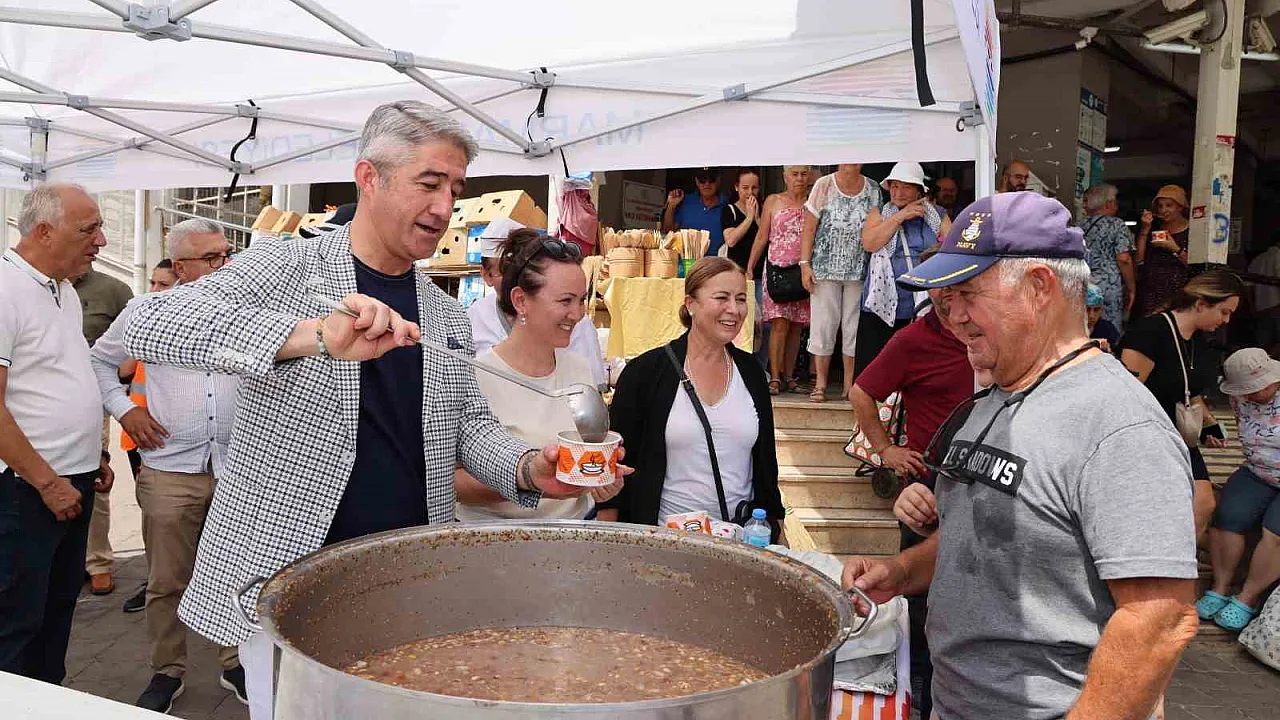 Marmaris Belediyesi, alışveriş için semt pazarına gelen vatandaşlara Muharrem ayı geleneği olan aşure ikram etti. Başkan Oktay da kazanın başına geçerek vatandaşlara aşure dağıttı.