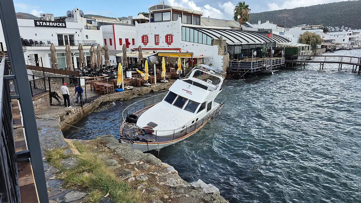 Muğla'nın Bodrum ilçesinde olumsuz hava şartları nedeniyle tonozdan ayrılan tekne kıyıya vurdu.