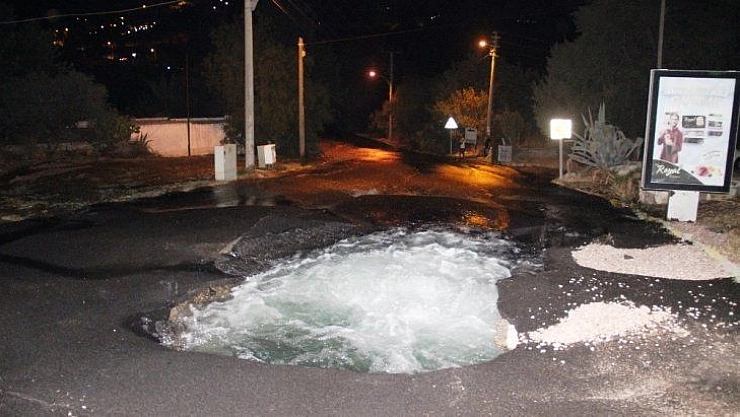 Muğla'nın Bodrum ilçesinde ana su hattı bomba gibi patladı, işyerleri ve bahçeler sular altında kaldı. Gece yarısı patlayan ana su hattı borusu esnafı isyan ettirdi.