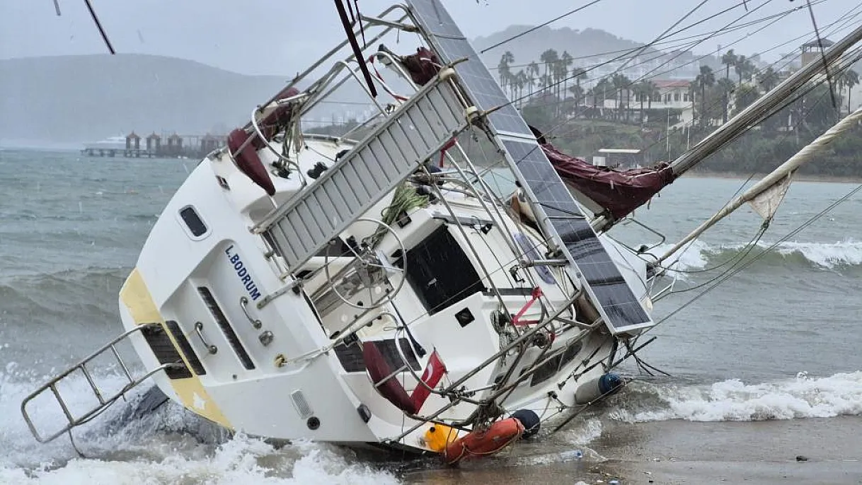 Muğla'nın Bodrum ilçesinde fırtına ve sağanak yağış etkili olurken, fırtına nedeniyle yelkenli tekne karaya vurdu.