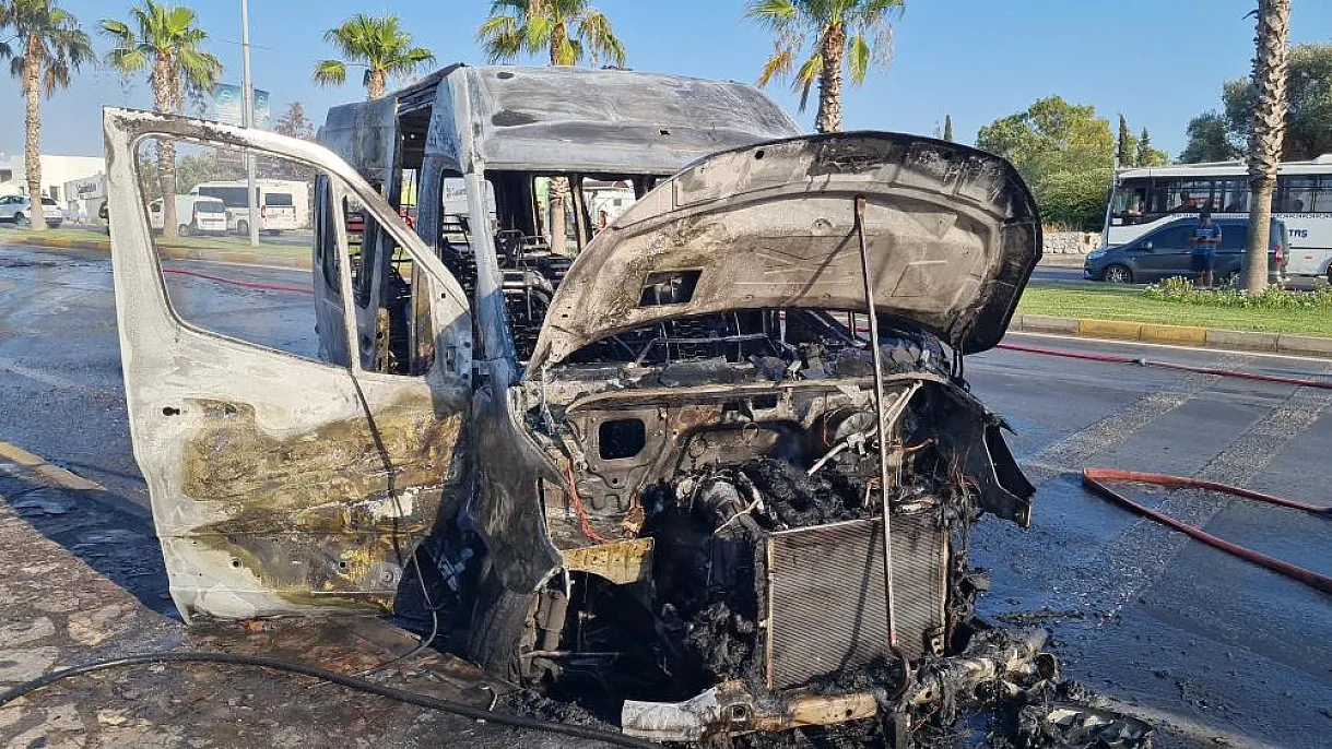 Muğla'nın Bodrum ilçesinde seyir halindeki minibüste çıkan yangın, korku dolu dakikaların yaşanmasına neden olurken tamamen yanan minibüs metal yığınına döndü.