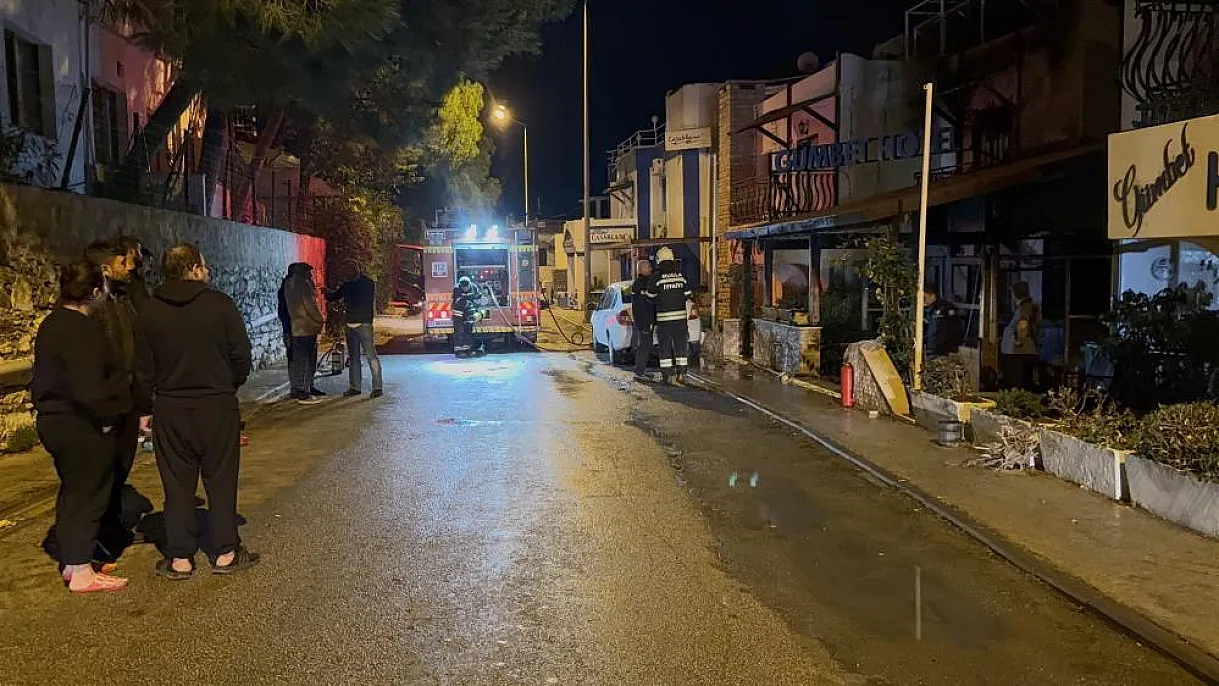 Muğla'nın Bodrum ilçesinde çıkan yangında bir otelin resepsiyonu alevlere teslim oldu.