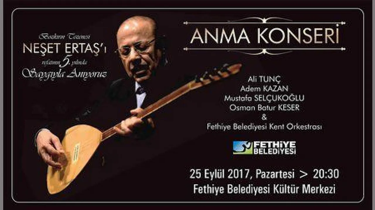 Fethiye Belediyesi, büyük üstat Neşet Ertaş’ı ölüm yıl dönümünde unutmadı. Fethiye Belediyesi Kültür Merkezi’ndeki anma programında Belediye sanatçıları Adem Kazan, Ali Tunç, Mustafa Selçukoğlu sahne alacak. Neşet Ertaş’ı Anma Konseri, 25 Eylül Pazartesi günü saat: 20.30’da Fethiye Belediyesi Kültür Merkezi salonunda gerçekleşecek.