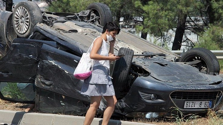Muğla’da önündeki araca çarparak takla atan araç sürücüsü kadın ve yanındaki yolcu kazadan burnu bile kanamadan kurtuldu.