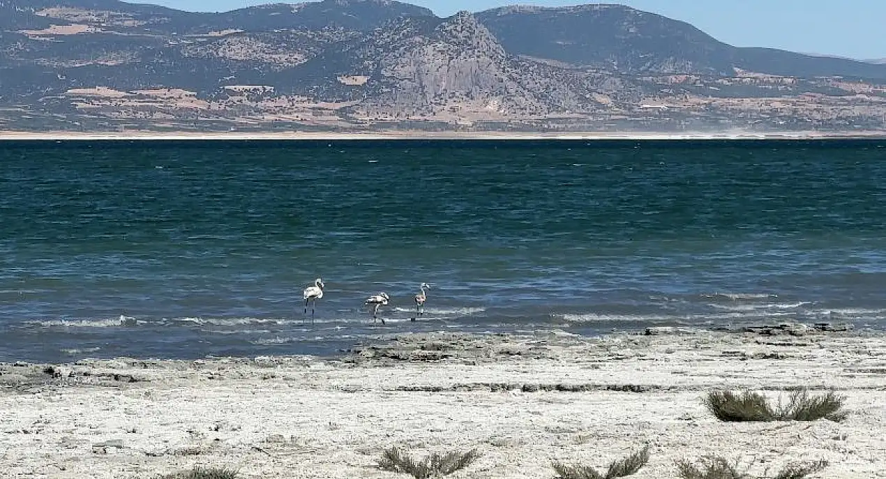 Burdur Gölü'nde balık tutmayı hayal ederken kuruyan gölde otlayan keçileri izliyor