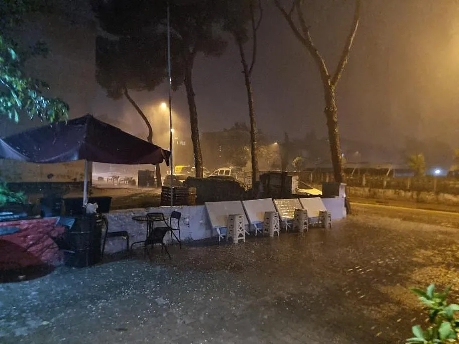 Milas'ta sağanak yağış sonucu derelerin taşması sokakları göle çevirdi, ceviz büyüklüğünde yağan dolu ise araçlara zarar verdi.