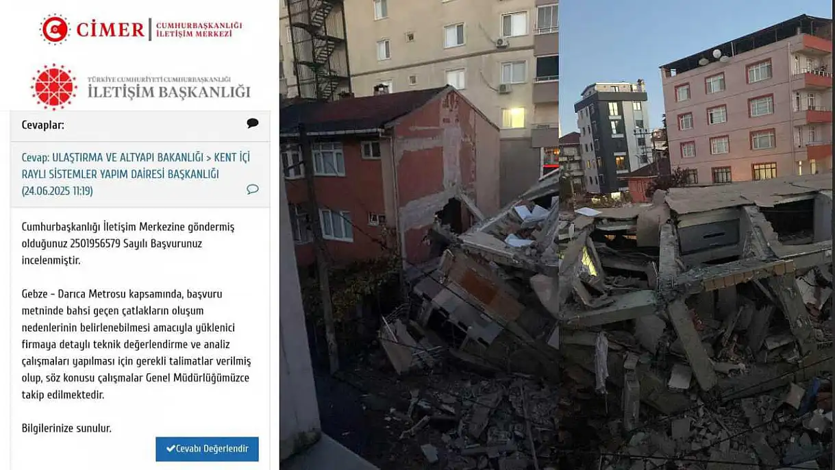 Daha önce binasında yaşanan sorunlar sebebiyle CİMER'e şikayette bulunduğunu anlatan Sinan Tekin, "Olayın başlangıcı dış kapımızın örtülmemesi ve açılmamasıyla oluştu. Kapımızı elimizin kuvvetiyle zor bir şekilde itiyorduk, hatta kapı örtülmeyecek duruma kadar geldi. Usta çağırdığımız zaman kastırma yöntemiyle çözüm buldu ve eve o şekilde giriş yapıyorduk. Bunlar, metro çalışmalarının sebebiyle oluştu, daha önceki zamanlar bu yoktu. Metroya olan uzaklık 10 metredir. Metro çalışması devam ettikçe çatlaklar çoğalmaya ve derinleşmeye başladı. Kızım bana CİMER'e şikayette bulunmamız gerektiğini söyledi. Şikayet dilekçemizi oluşturduk ve yetkililer gelerek incelemelerde bulundu" dedi.