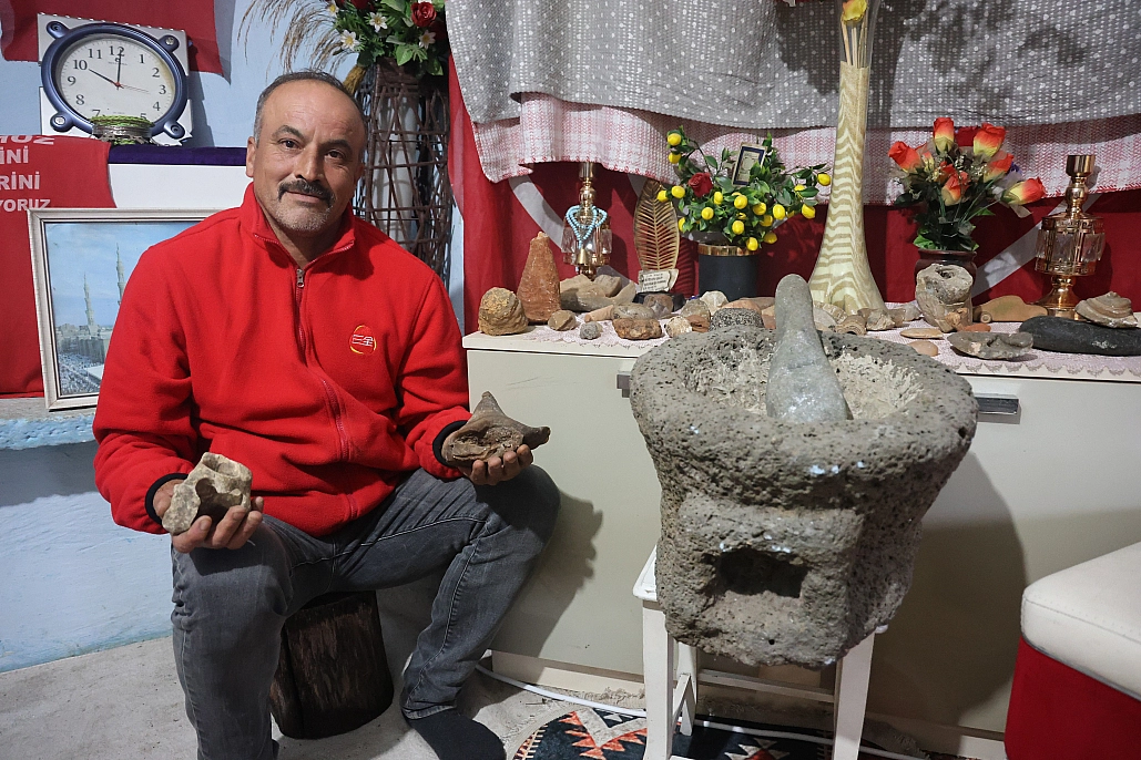 Çobanlık yapan Mehmet Kızgın, 8 yıldır dağlarda gezdiği esnada hoşuna giden taşları toplayarak evinde sergiliyor.