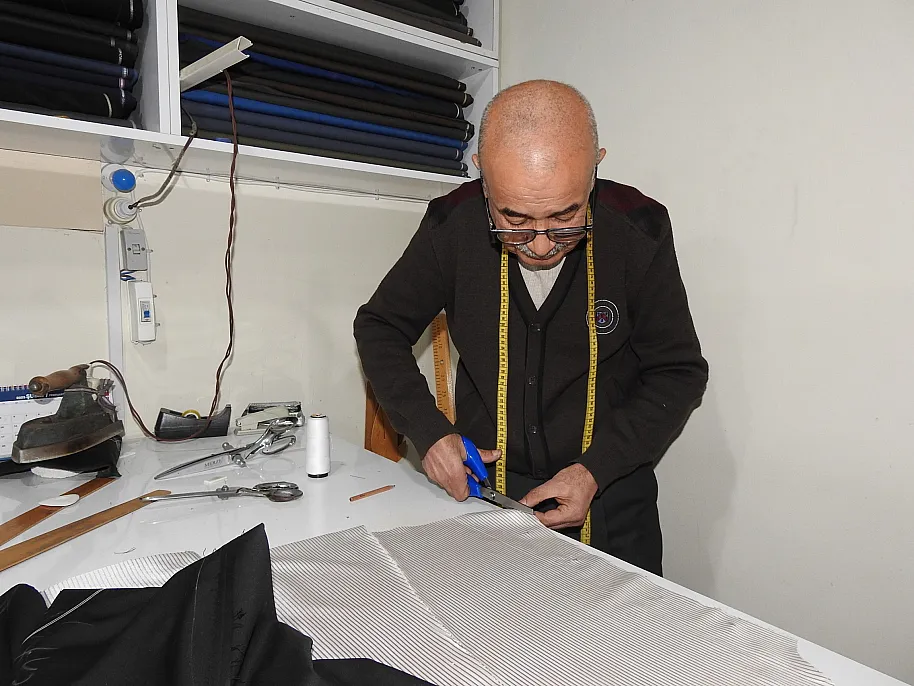 Terzilik yapan 64 yaşındaki Ahmet Aslan, çocuk yaşta eline aldığı iğne ipliği 56 yıldır bırakmadı.