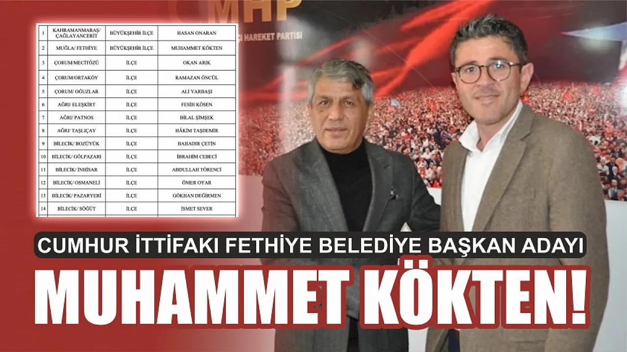 Milliyetçi Hareket Partisi, 2 büyükşehir ilçe, 53 ilçe belediye başkan adayı olmak üzere toplam 55 adayını daha açıkladı. Yapılan açıklamaya göre Cumhur ittifakı Fethiye belediye Başkan Adayı Muhammet Kökten Oldu.