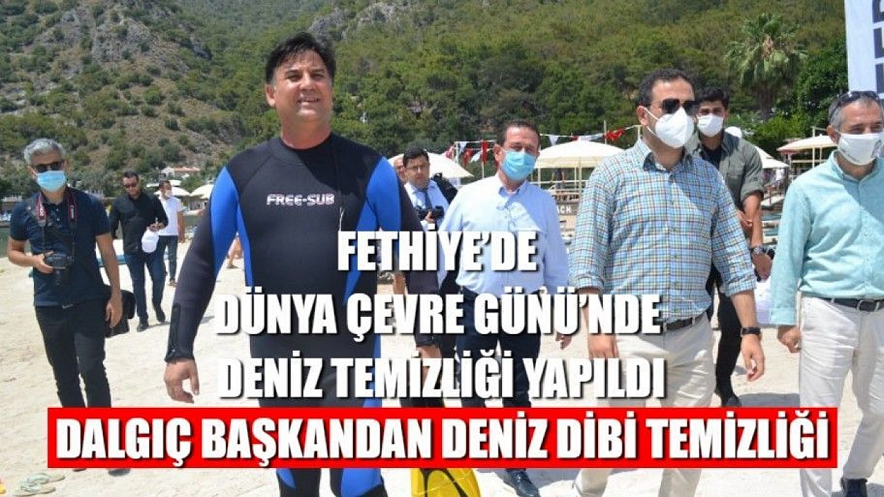 Dalgıç elbisesi giyen sertifika sahibi Fethiye Belediye Başkanı Alim Karaca, Dünya Çevre Haftası etkinlikleri kapsamında düzenlenen etkinlikte Ölüdeniz Lagünü'nde dalış yaparak, deniz dibi temizliğine katıldı.