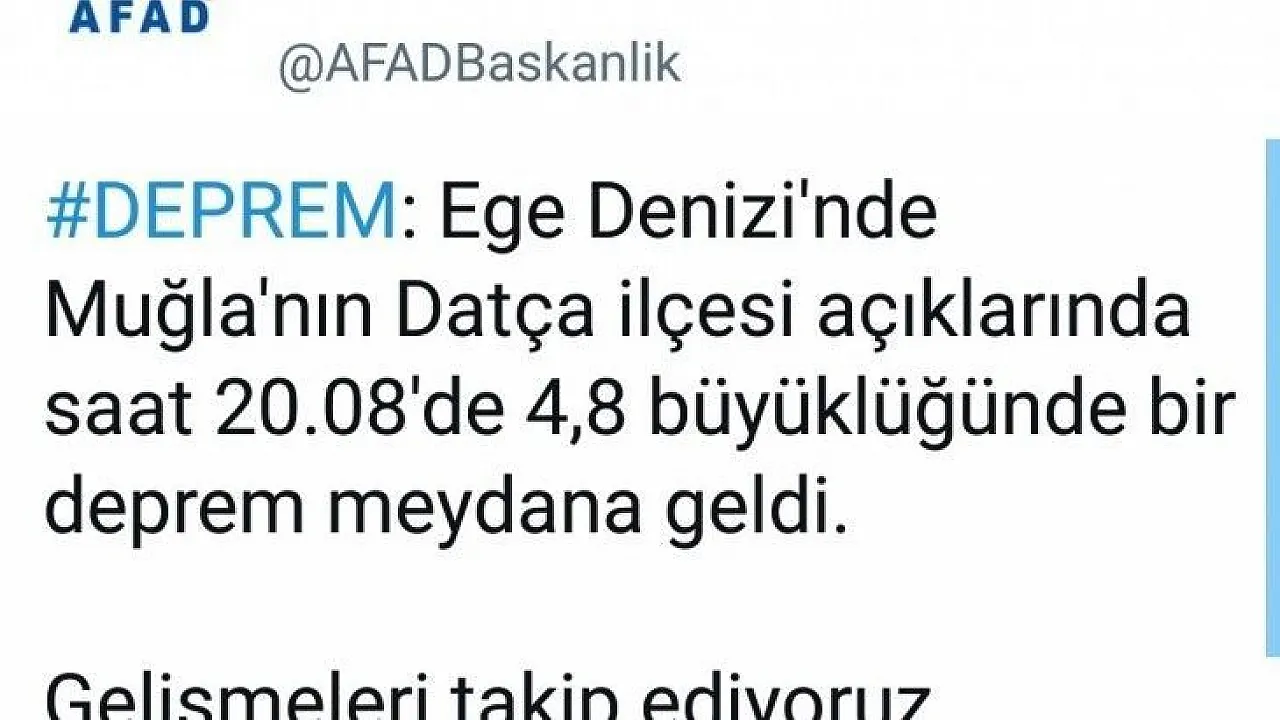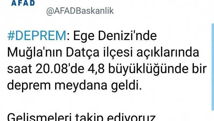 AFAD, Datça açıklarında merkez üssü Ege Denizi'nde saat 20.08 sıralarında 4.8 büyüklüğünde bir deprem meydana geldiğini duyurdu.