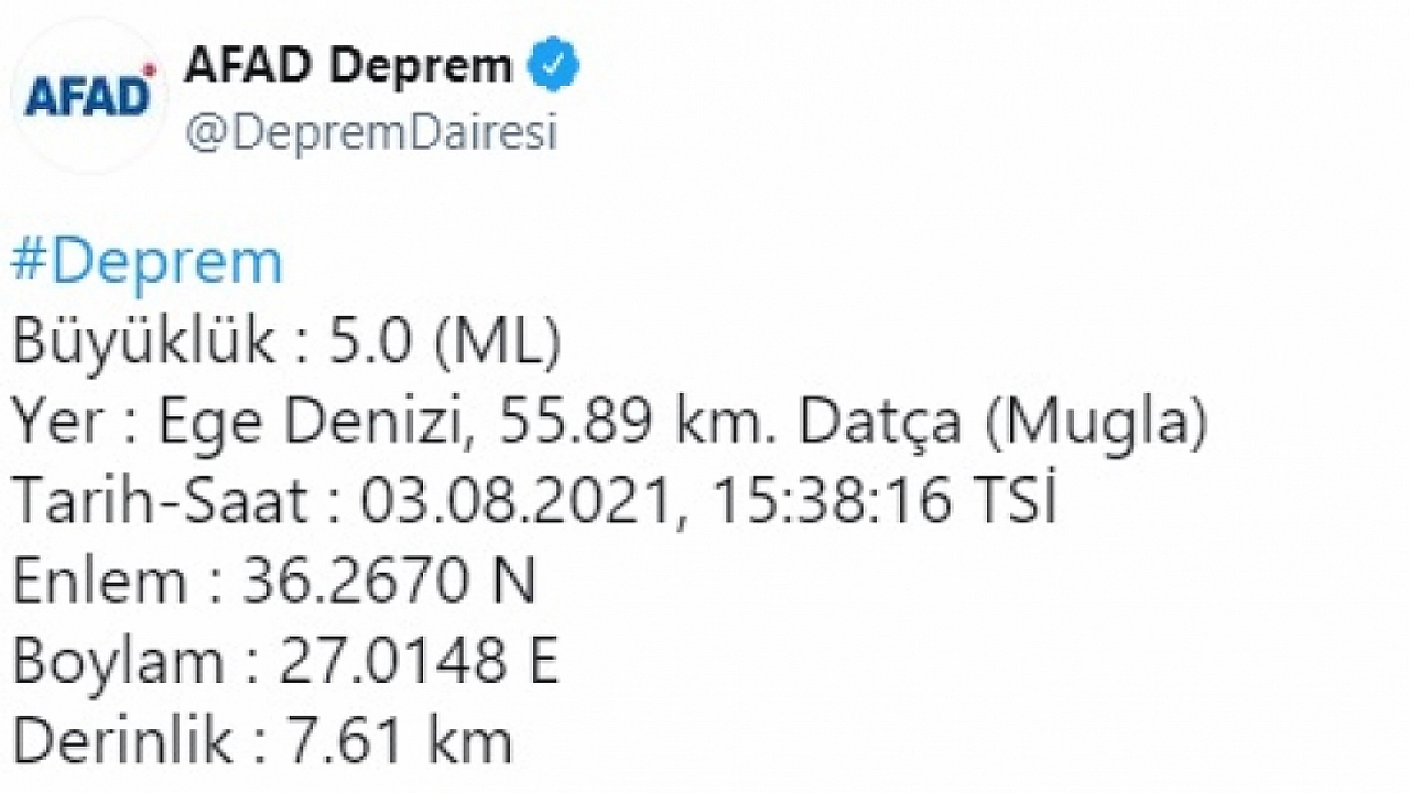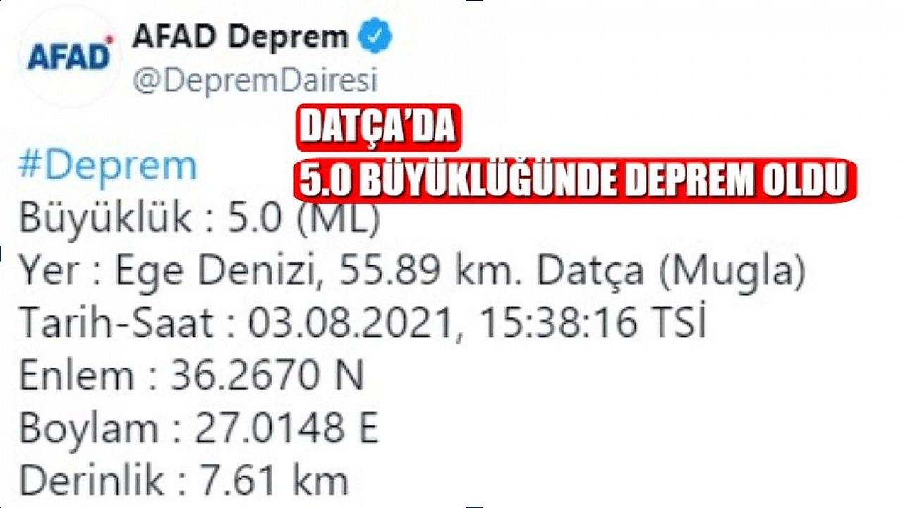 AFAD'dan alınan verilere göre Muğla'da 5.0 büyüklüğünde deprem meydana geldi. Ege Denizi'nde Muğla'nın Datça ilçesi açıklarında 5.0 büyüklüğünde bir deprem meydana geldi. Yerin 7.61 kilometre altında gerçekleşen deprem çevre illerde de hissedildi.