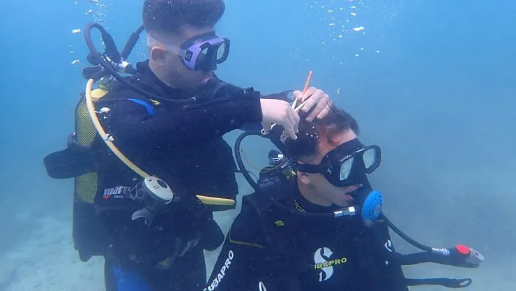 Manisa'da çocuk yaşlarda kuaförlüğe başlayan Emirhan Güngör (17), mesleğinde daha iyi yerlere gelebilmek için maharetini farklı yönlerde de kullanmaya başladı. Denizin altında tıraş yapmak için harekete geçen genç kuaför, İzmir'in Karaburun ilçesine gelerek dalgıç kıyafetini giyip yaklaşık 5 metre derinliğe daldı.