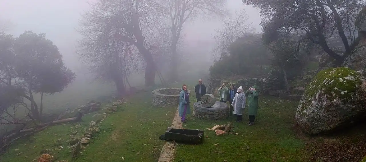 Orman içinde yaptığımız yürüyüşün sonunda Labranda’ya gelerek, Profesyonel turist rehberi Hakan Bahçecioğlu’nun eşliğinde kutsal alanla ilgili bilgi aldık. Karya kavimlerinin yılın belirli günlerinde toplanarak, çeşitli ayinler ve kurban törenleri yaptıkları ve aynı zamanda ülkeleri için önemli kararlar aldıkları kutsal alanın yapılarını sisler içinde gezdik. Kutsal sayılmasına neden olan yarık kayaya çıkarak, buradaki anıt mezarı da ziyaret ettik. Rotamızın üzerindeki, Horasan erenleri tarafından kurulan Eski (İkiz) Türbe köyüne gittik. 16 yıl önce geldiğimizde İkiz türbelerden birinin tamamen yıkılmış, diğer türbenin duvarının bir bölümünün bir menengiç ağacının devrilmesiyle birlikte yıkıldığını görmüştük.