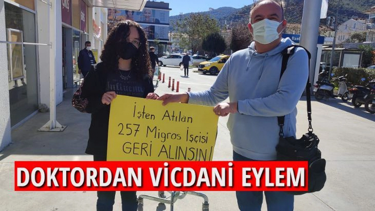Fethiye Ağız ve Diş Sağlığı Merkezi'nde Diş Doktoru olarak görev yapan Cenk Balcıoğlu bir zincir marketten maaşlarına zam istedikleri için işlerine son verildiği iddia edilen 257 işçi için markette eylem yaptı.