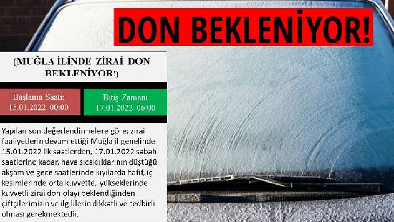 Meteoroloji 4. Bölge Müdürlüğü Tahmin ve Uyarı Merkezi tarafından don olayına karşı tedbirli olunması yönünde uyarı yapılırken yapılan açıklamada,’’ Yapılan son değerlendirmelere göre; zirai faaliyetlerin devam ettiği Muğla il genelinde 15 Ocak 2022 ilk saatlerinden, 17 Ocak 2022 sabah saatlerine kadar, hava sıcaklıklarının düştüğü akşam ve gece saatlerinde kıyılarda hafif, iç kesimlerinde orta kuvvette, yükseklerinde kuvvetli zirai don olayı beklendiğinden çiftçilerimizin ve ilgililerin dikkatli ve tedbirli olması gerekmektedir’’ ifadelerine yer verdi.