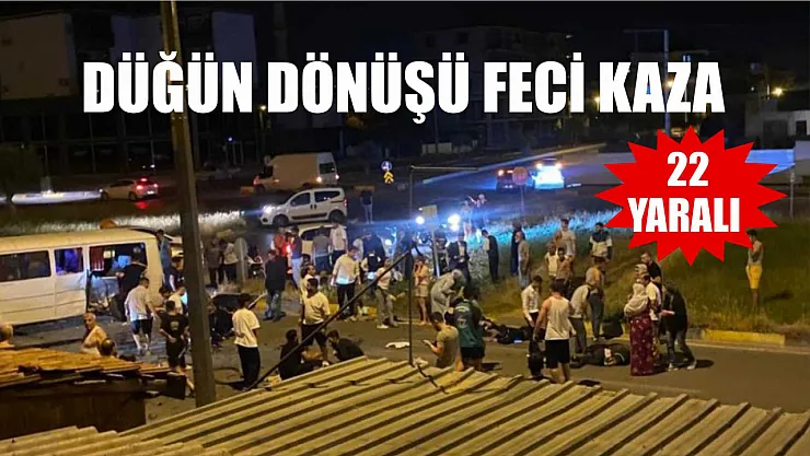 Düğünden dönenlerin bulunduğu minibüs ile otomobilin çarpıştığı kazada ortalık savaş alanına döndü. Çarpışmanın etkisiyle yaralıların yola savrulduğu kazada 22 kişi yaralandı.
