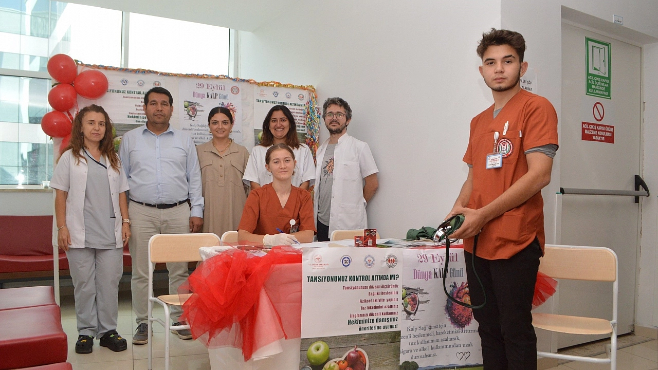 Muğla Eğitim ve Araştırma Hastanesi'nde Dünya Kalp Günü çerçevesinde kardiyoloji polikliniklerinin olduğu alanda tansiyon ölçümü yapmak için stant kuruldu.