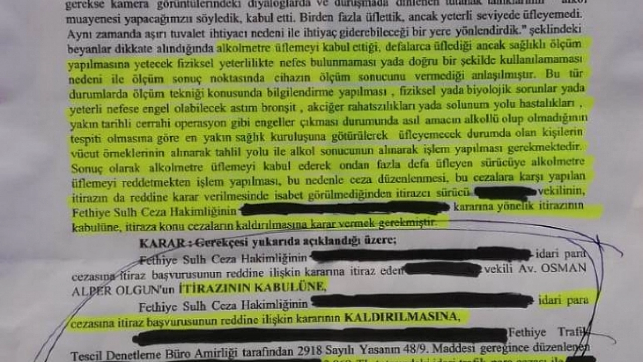 İsminin açıklanmasını istemeyen kadın sürücüye Fethiye Sulh Ceza Hakimliği başvurusunun reddine karar verirken, Avukatı Osman Alper Olgun ile bir üst mahkeme olan Muğla Sulh Ceza Hakimliği ise başvuruyu inceleyip; itirazının kabulüne, 2 bin 869 TL tutarındaki idari trafik para cezası ile sürücü belgesinin 2 yıl ile geri alınması cezasının kaldırılmasına karar verdi. Adeta emsal gibi bu kararda Muğla Sulh Ceza Hakimliği itiraz dilekçesi, cevap dilekçesi toplanan bilgi ve belgeleri birlikte değerlendirip kamera görüntülerinin izlenmesi ile edinilen kanaate göre alkol metreyi üflemeyi ret hususunun tam olarak gerçekleşmediği şeklinde değerlendirdi.