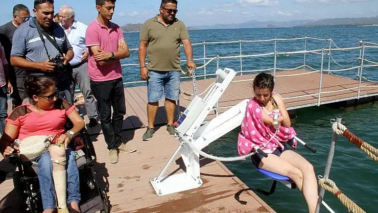 Fethiye ilçesinde engellilerin rahat denize girebilmesi ve güneşlenmesi için belediye tarafından yapılan yüzer engelli güneşlenme terası gerçekleştirilen törenle açıldı.