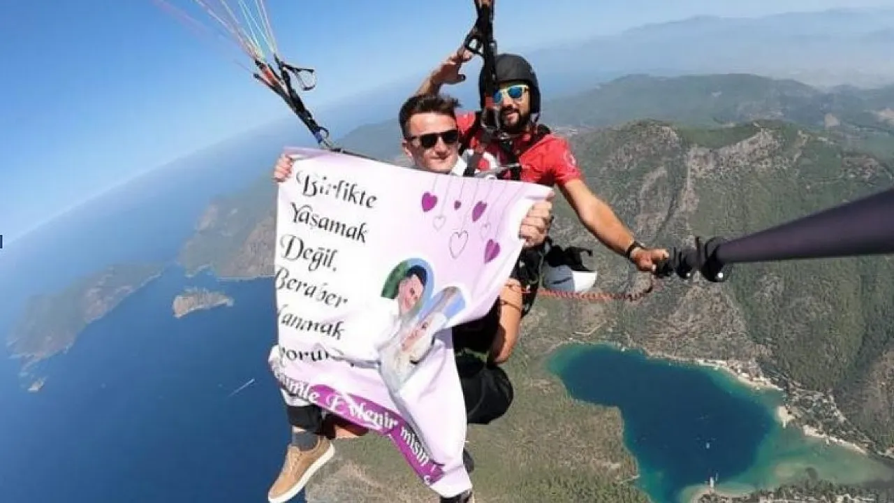 Fethiye'de kız arkadaşıyla yamaç paraşütü yapan Süleyman Hilmi Kaya, Ölüdeniz manzarası eşliğinde açtığı pankartla evlilik teklifi yaptı.