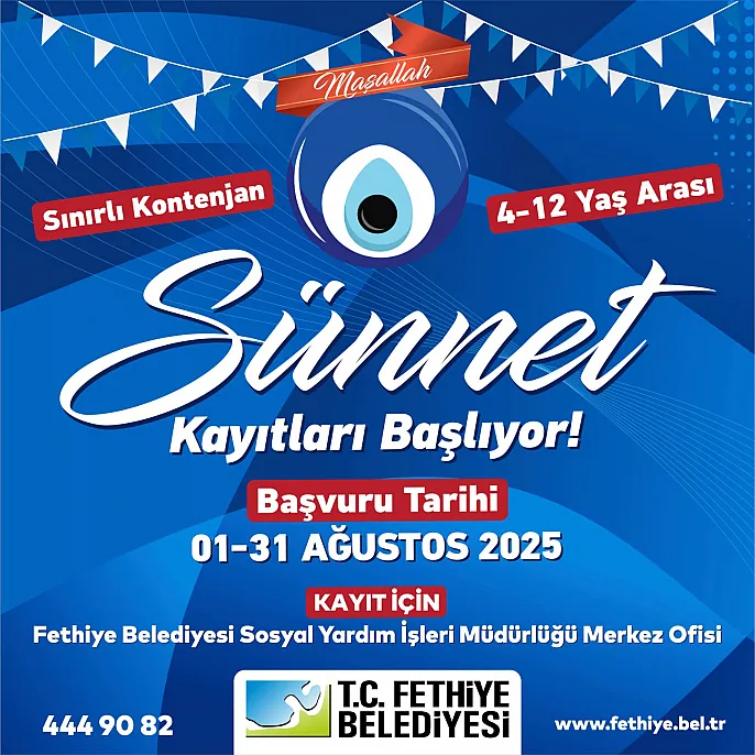 Fethiye Belediyesi, sosyal belediyecilik anlayışı doğrultusunda ilçede yaşayan ihtiyaç sahibi ailelerin çocuklarına yönelik ücretsiz sünnet hizmeti sunuyor. 4–12 yaş aralığındaki erkek çocuklar için gerçekleştirilecek sünnet operasyonları, Özel Letoon Hastanesi'nde uzman sağlık personeli tarafından güvenli ve hijyenik koşullarda yapılacak.