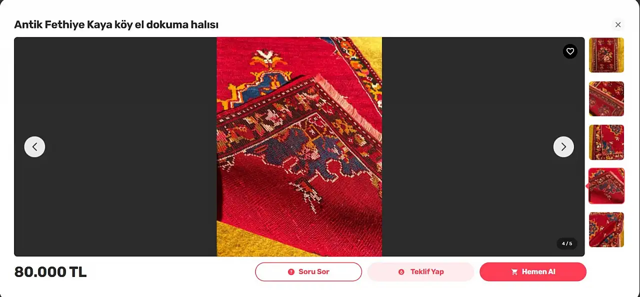 online satış mağazasında 80 bin TL fiyatla ilana çıkan antik halının, ikinci el online satış platformu üzerinden satışa sunulması, el dokuması ve antika ürünlere olan dijital ilgiyi de gözler önüne seriyor. Son yıllarda antika halıların internet üzerinden alıcı bulması, piyasadaki erişimi artıran önemli unsurlar arasında gösteriliyor.