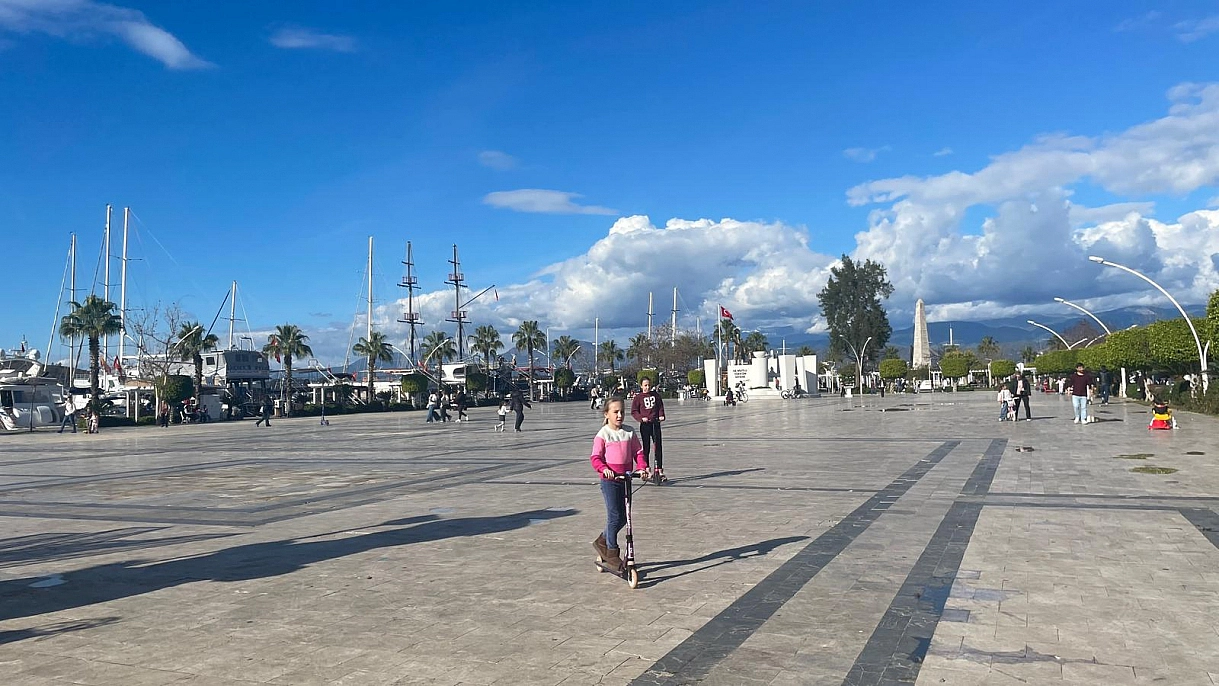 Fırtına ve yağışlı günlerin ardından Fethiye'de güneşli havayı fırsat bilen vatandaşlar sahil kenarlarına ve meydanlara akın etti.