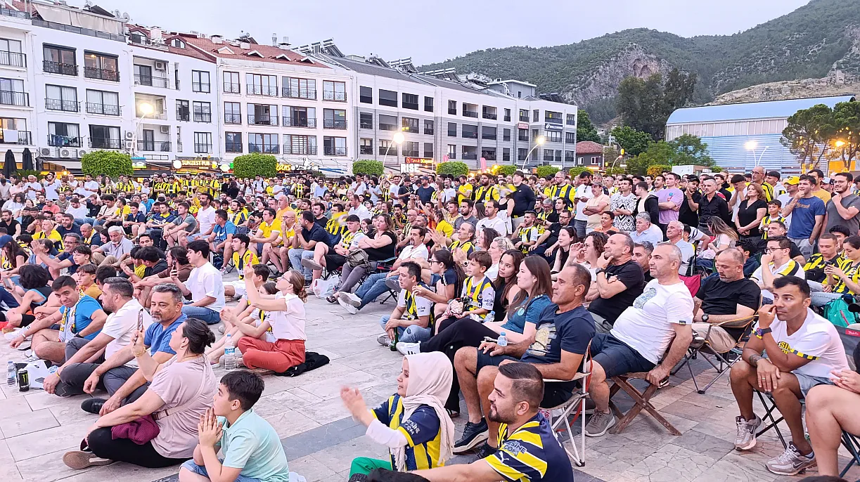 Fethiye Belediyesi ve Fethiye Fenerbahçeliler Derneği tarafından Beşkaza Meydanı'na kurulan dev ekranda Fenerbahçeli taraftarlar Monaco ile oynanan EuroLeague final maçı heyecanını birlikte yaşıyor.