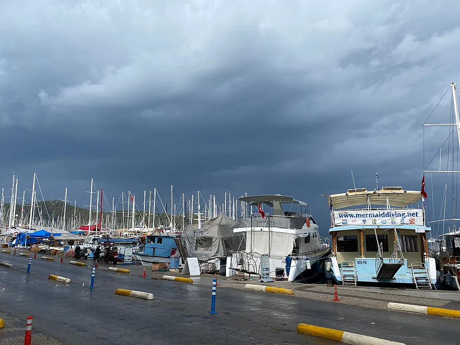 Muğla'nın Fethiye ilçesinde, dün uyarısı yapıldığı üzere kuvvetli fırtına ve gök gürültülü sağanak yağış etkisini gösteriyor.