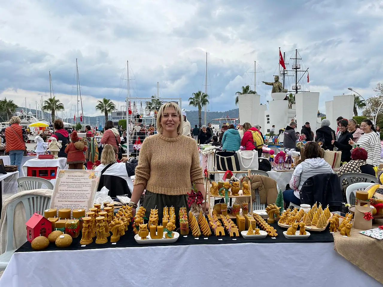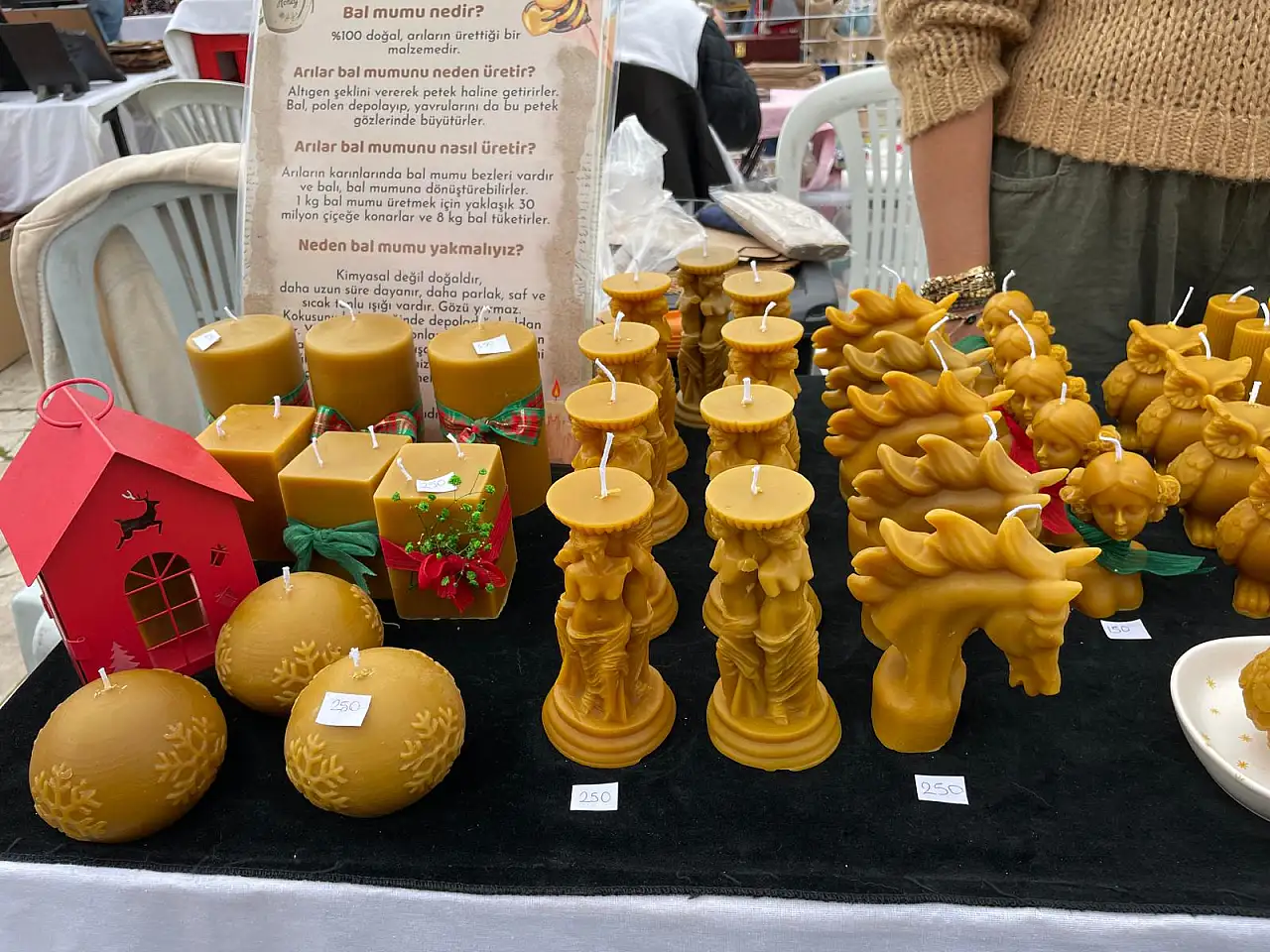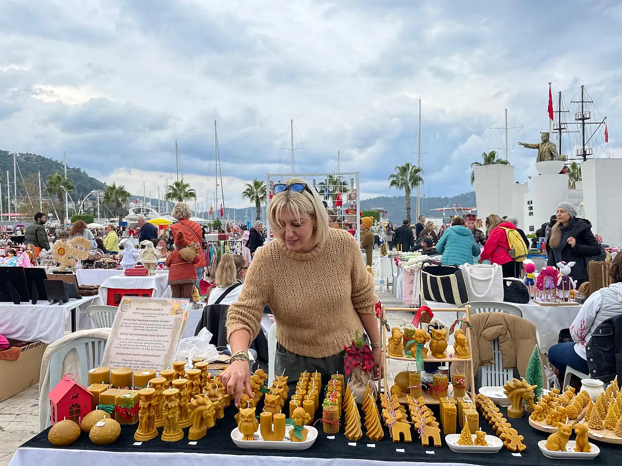 FETAV tarafından Fethiye Beşkaza Meydanı'nda düzenlenen Yeni Yıl Pazarı'nda stant açan arıcı Gülşehri Çukur, balmumu ve arı ürünlerinden tamamen el emeğiyle ürettiği doğal ürünlerin özellikle yılbaşı hediyesi olarak yoğun ilgi gördüğünü söyledi.