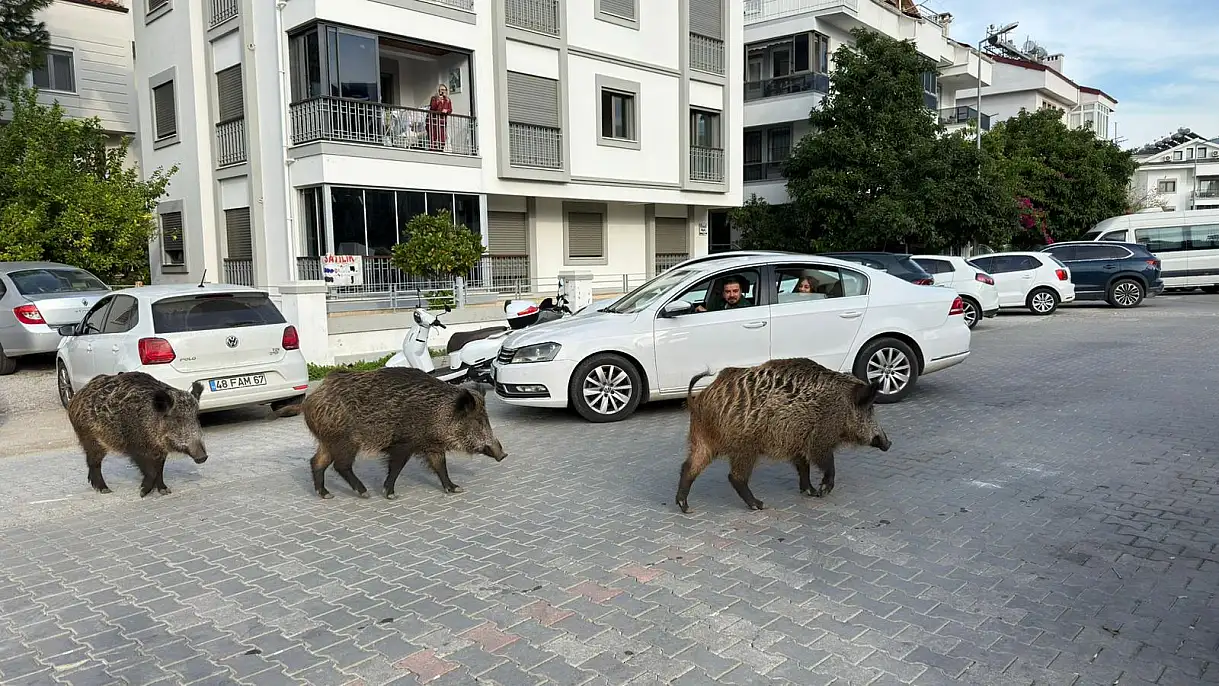 Fethiye sahil bandı ve ara sokaklarında görülen yaban domuzları, insanlara alışmış halde çevrede dolaşırken vatandaşlar ve sürücüler durumu uzaktan izledi.