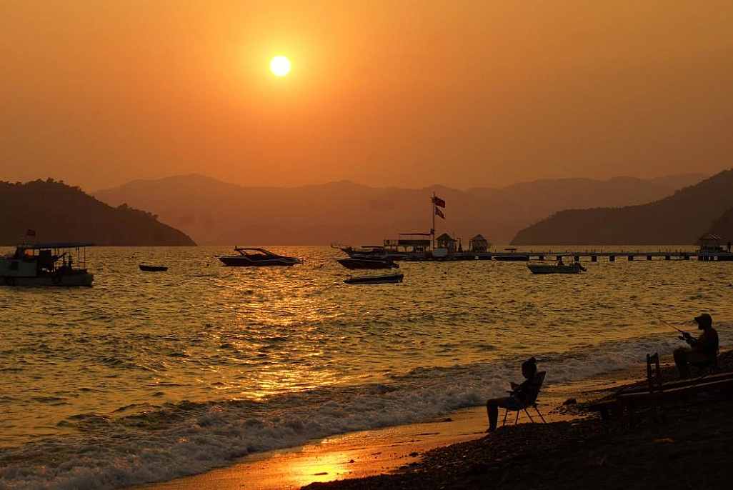 Muğla'nın Fethiye ilçesinde gün batımı eşsiz görüntülere sahne olurken, iskeledeki Türk bayrağı güneşin batışı ile birlikte fotoğraf karelerine yansıdı.