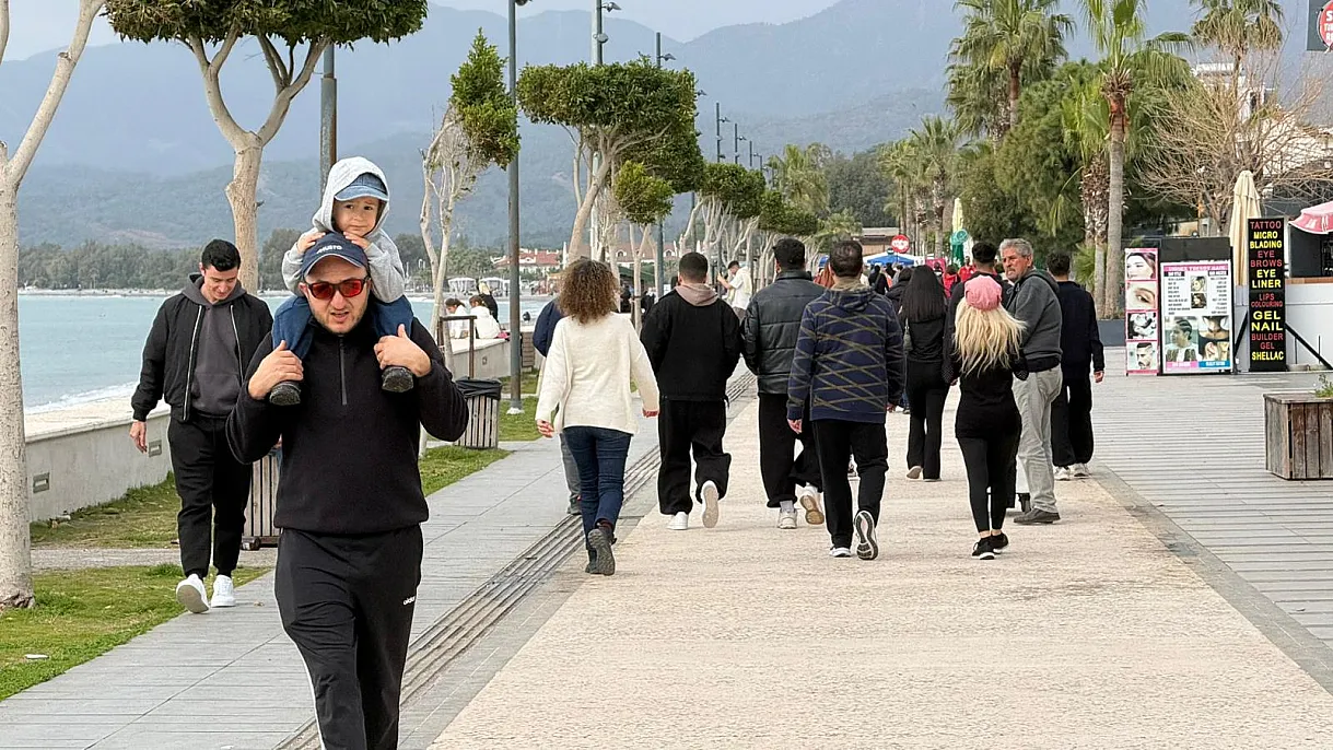 Muğla'nın Fethiye ilçesinde hava sıcaklığının 19 dereceye kadar yükselmesiyle birlikte vatandaşlar, hafta sonunu değerlendirmek için Çalış Plajı'na akın etti.