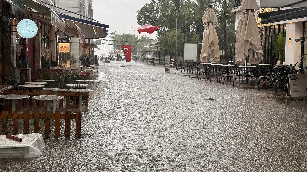 Fethiye'de şiddetli sağanak yağış: Caddeler göle döndü