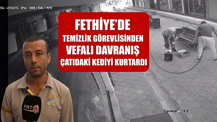 Fethiye Belediyesi Temizlik İşleri Müdürlüğü'nde görev yapan temizlik görevlisi Atik Şahin, temizlik yaptığı sırada fark ettiği bir kediyi çatıdan düşmek üzereyken son anda kurtardı.