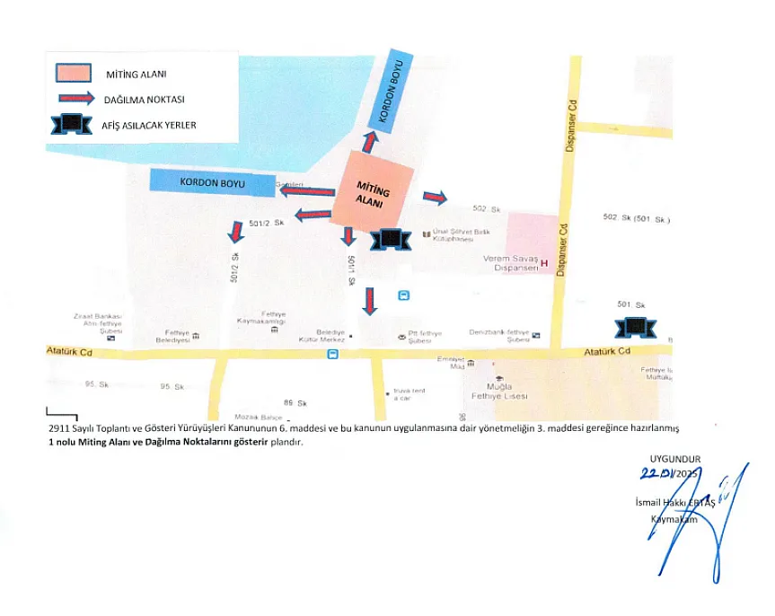 Fethiye Kaymakamlığı, 2025 yılı için toplantı ve gösteri yürüyüşleri alanlarını belirledi. Karar, 13 Mart 2014 tarihli ve 28940 sayılı Resmi Gazete'de yayımlanan 6529 sayılı kanun ile 2911 sayılı Toplantı ve Gösteri Yürüyüşleri Kanunu'nun 6. Maddesinde yapılan değişiklik gereğince alındı.