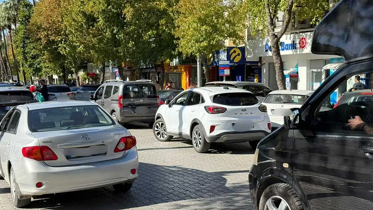 Artan araç sayısı ve yetersiz otopark nedeniyle sürücüler araçlarını çift sıra park etmek zorunda kalıyor. Atatürk Caddesi'nde trafik adeta durma noktasına geldi.