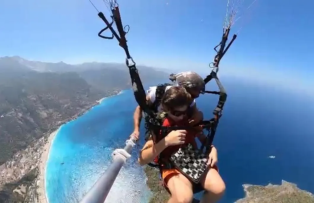 Muğla'nın Fethiye ilçesinde düzenlenen satranç turnuvalarında birincilik elde eden genç sporcu Yağız Kasım Atlıhan, sıra dışı bir deneyime imza attı. Atlıhan, dünyaca ünlü Babadağ'dan gerçekleştirdiği yamaç paraşütü uçuşunda, pilot Şenol Arat ile birlikte gökyüzünde satranç oynadı.