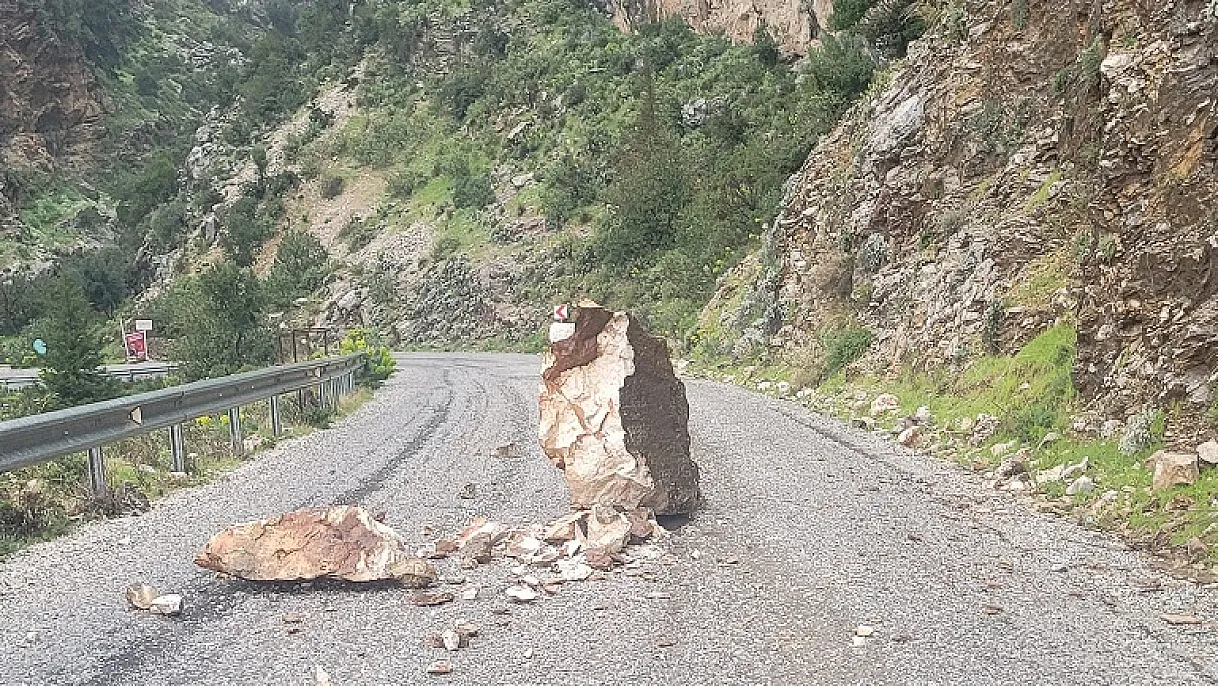 Muğla'nın Fethiye ilçesinde Faralya Mahallesi'nde sabah saatlerinde yol üzerine kaya düştü. Kayanın düştüğü esnada yoldan geçen kimsenin olmaması da büyük bir faciayı önledi.