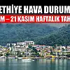 Meteoroloji Genel Müdürlüğü verilerine göre, Fethiye'de 17 Kasım – 21 Kasım 2025 tarihleri arasında hava sıcaklıkları 8-21°C arasında değişecek.
