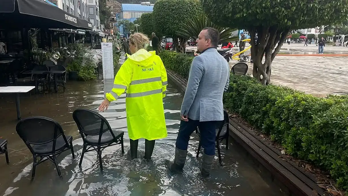 Muğla'nın Fethiye ilçesinde Fethiye Kaymakamı Fatih Akkaya, ilçe genelinde yaşanan yoğun yağış sonrası incelemelerde bulundu.