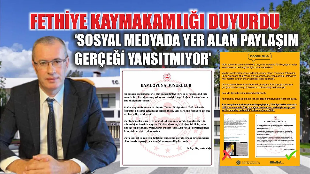 Fethiye Kaymakamlığı tarafından son günlerde sosyal medyada, 'Fethiye'de bir mekânda milli maç sırasında Türk bayrağının asılmaması nedeniyle kavga çıktı ve bir vatandaş darbedildi' şeklindeki iddialarına yanıt geldi.