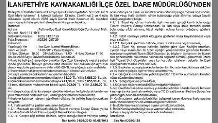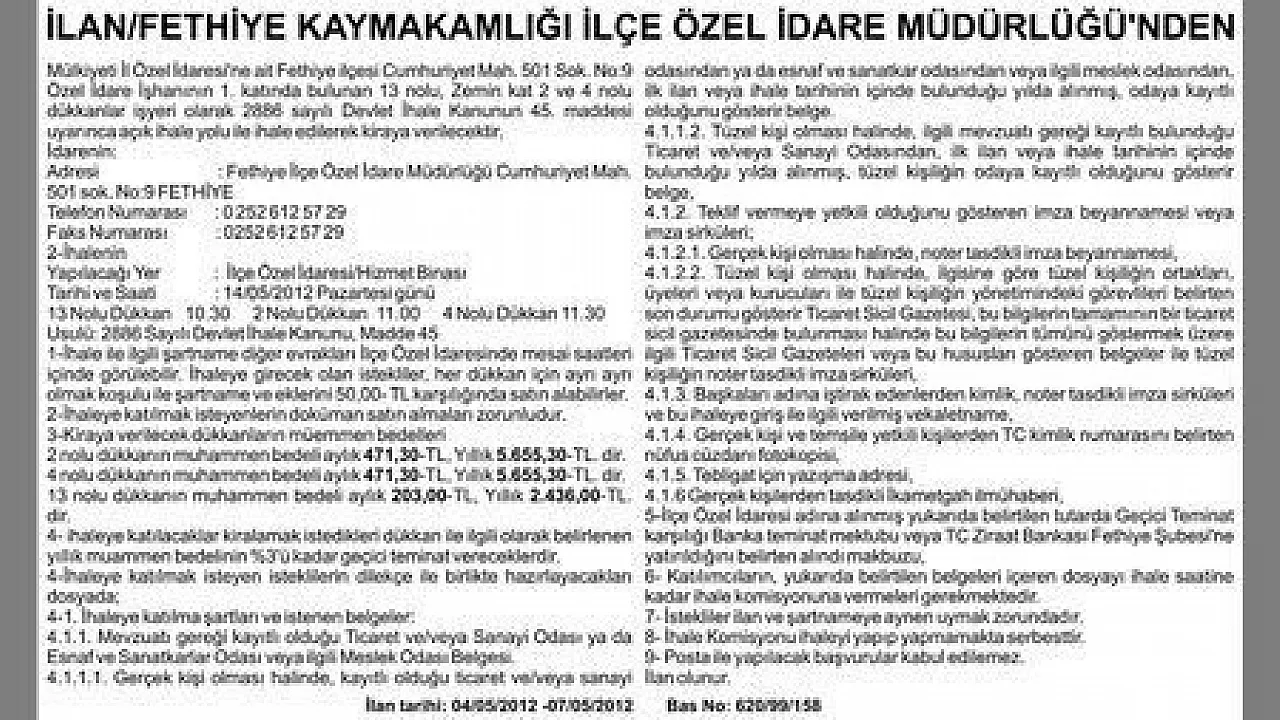 İLAN/FETHİYE KAYMAKAMLIĞI İLÇE ÖZEL İDARE MÜDÜRLÜĞÜ'NDEN Mülkiyeti İl Özel İdaresi'ne ait Fethiye ilçesi Cumhuriyet Mah. 501 Sok. No:9 Özel İdare İşhanının 1. katında bulunan 13 nolu, Zemin kat 2 ve 4 nolu dükkanlar işyeri olarak 2886 sayılı Devlet İhale Kanunun 45. maddesi uyarınca açık ihale yolu ile ihale edilerek kiraya verilecektir. İdarenin: Adresi : Fethiye İlçe Özel İdare Müdürlüğü Cumhuriyet Mah. 501 sok. No:9 FETHİYE Telefon Numarası : 0 252 612 57 29 Faks Numarası : 0252 612 57 29 2-İhalenin Yapılacağı Yer : İlçe Özel İdaresi/Hizmet Binası Tarihi ve Saati : 14/05/2012 Pazartesi günü 13 Nolu Dükkan 10.30 2 Nolu Dükkan 11.00 4 Nolu Dükkan 11.30 Usulü: 2886 Sayılı Devlet İhale Kanunu, Madde 45 1-İhale ile ilgili şartname diğer evrakları İlçe Özel İdaresinde mesai saatleri içinde görülebilir. İhaleye girecek olan istekliler, her dükkan için ayrı ayrı olmak koşulu ile şartname ve eklerini 50,00- TL karşılığında satın alabilirler. 2-İhaleye katılmak isteyenlerin doküman satın almaları zorunludur. 3-Kiraya verilecek dükkanların müemmen bedelleri 2 nolu dükkanın muhammen bedeli aylık 471,30-TL, Yıllık 5.655,30-TL. dir. 4 nolu dükkanın muhammen bedeli aylık 471,30-TL, Yıllık 5.655,30-TL. dir. 13 nolu dükkanın muhammen bedeli aylık 203,00-TL, Yıllık 2.436,00-TL. dir. 4- ihaleye katılacaklar kiralamak istedikleri dükkan ile ilgili olarak belirlenen yıllık muammen bedelinin %3'ü kadar geçici teminat vereceklerdir. 4-İhaleye katılmak isteyen isteklilerin dilekçe ile birlikte hazırlayacakları dosyada; 4-1. İhaleye katılma şartları ve istenen belgeler: 4.1.1. Mevzuatı gereği kayıtlı olduğu Ticaret ve/veya Sanayi Odası ya da Esnaf ve Sanatkarlar Odası veya ilgili Meslek Odası Belgesi. 4.1.1.1. Gerçek kişi olması halinde, kayıtlı olduğu ticaret ve/veya sanayi odasından ya da esnaf ve sanatkar odasından veya ilgili meslek odasından, ilk ilan veya ihale tarihinin içinde bulunduğu yılda alınmış, odaya kayıtlı olduğunu gösterir belge. 4.1.1.2. Tüzel kişi olması halinde, ilgili mevzuatı gereği kayıtlı bulunduğu Ticaret ve/veya Sanayi Odasından, ilk ilan veya ihale tarihinin içinde bulunduğu yılda alınmış, tüzel kişiliğin odaya kayıtlı olduğunu gösterir belge, 4.1.2. Teklif vermeye yetkili olduğunu gösteren imza beyannamesi veya imza sirküleri; 4.1.2.1. Gerçek kişi olması halinde, noter tasdikli imza beyannamesi, 4.1.2.2. Tüzel kişi olması halinde, ilgisine göre tüzel kişiliğin ortakları, üyeleri veya kurucuları ile tüzel kişiliğin yönetimindeki görevlileri belirten son durumu gösterir Ticaret Sicil Gazetesi, bu bilgilerin tamamının bir ticaret sicil gazetesinde bulunması halinde bu bilgilerin tümünü göstermek üzere ilgili Ticaret Sicil Gazeteleri veya bu hususları gösteren belgeler ile tüzel kişiliğin noter tasdikli imza sirküleri, 4.1.3. Başkaları adına iştirak edenlerden kimlik, noter tasdikli imza sirküleri ve bu ihaleye giriş ile ilgili verilmiş vekaletname, 4.1.4. Gerçek kişi ve temsile yetkili kişilerden TC kimlik numarasını belirten nüfus cüzdanı fotokopisi, 4.1.5. Tebligat için yazışma adresi, 4.1.6 Gerçek kişilerden tasdikli İkametgah ilmühaberi, 5-İlçe Özel İdaresi adına alınmış yukarıda belirtilen tutarda Geçici Teminat karşılığı Banka teminat mektubu veya TC Ziraat Bankası Fethiye Şubesi'ne yatırıldığını belirten alındı makbuzu, 6- Katılımcıların, yukarıda belirtilen belgeleri içeren dosyayı ihale saatine kadar ihale komisyonuna vermeleri gerekmektedir. 7- İstekliler ilan ve şartnameye aynen uymak zorundadır. 8- İhale Komisyonu ihaleyi yapıp yapmamakta serbesttir. 9- Posta ile yapılacak başvurular kabul edilemez. İlan olunur. İlan tarihi: 04/05/2012 -07/05/2012 Bas No: 620/99/158