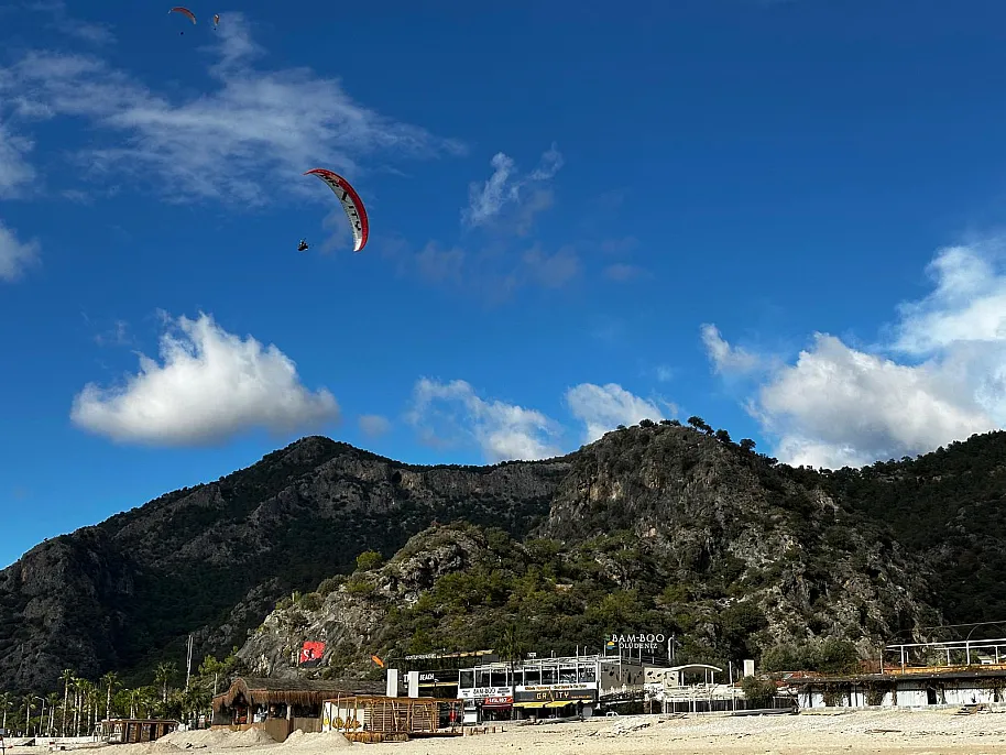 Muğla'nın Fethiye ilçesinin her yaz sezonunda gözbebeği olan Ölüdeniz'de Aralık ayının sonlarına gelinmesiyle birlikte güzel havayı fırsat bilenler yamaç paraşütüyle doyasıya vakit geçiriyor.